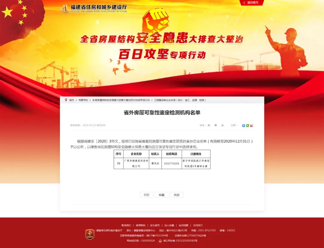 根據閩建安〔2020〕3號文,我司在福建省房屋結構安全隱患大排查大整治百日攻堅專項行動中順利通過福建省住建廳的備案工作,現已取得福建省房屋可靠性鑒定資質省外企業認可