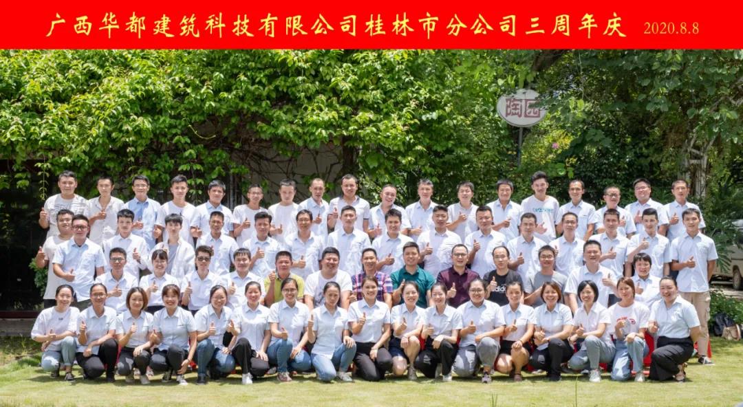 廣西華都建筑科技有限公司桂林市分公司成立三周年了。2020年8月8日,公司董事、公司總部領導以及分公司全體員工前往桂林市‘世外桃源’舉辦廣西華都建筑科技有限公司桂林市分公司三周年慶典活動。