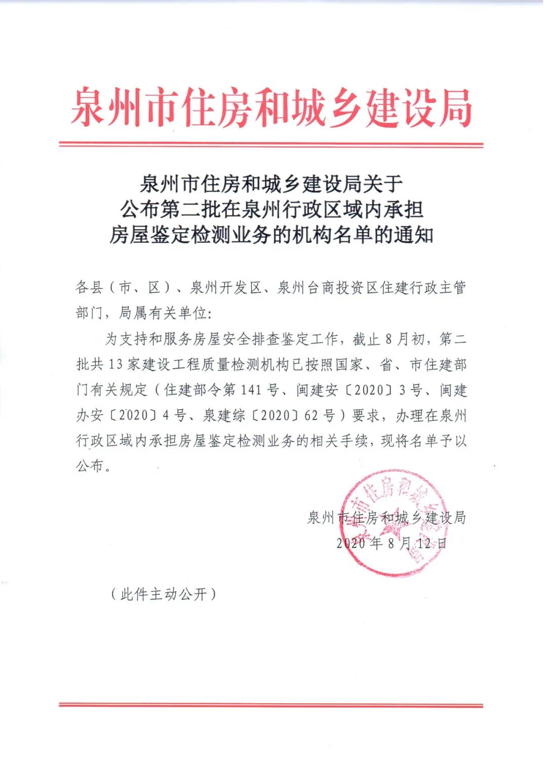 繼我司順利在福建省房屋結構安全隱患大排查大整治百日攻堅專項行動中順利通過福建省住建廳的備案工作后,按照有關規定的要求,我司繼續申請辦理在泉州行政區域內承擔房屋鑒定檢測業務的相關手續,現已取得泉州市房屋安全鑒定檢測業務資質,可在泉州市開展房屋安全鑒定檢測工作。